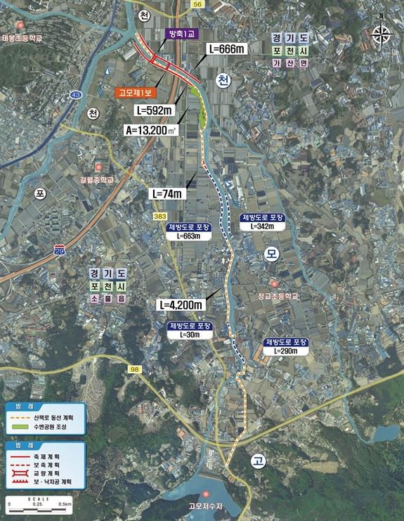 정비사업은 포천시 소흘읍 고모리에서 가산면 일원까지 총 연장 4.1km 구간을 대상으로 추진된다. 하천 제방 1.26km 보강을 통해 고모천의 홍수 대응 능력을 우선 개선하고 하천 유휴지를 활용하여 수변공원과 산책로를 조성해 주민들이 안전하게 이용할 수 있도록 하는 사업이다.