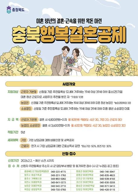 ‘충북행복결혼공제’는 충북 도내 미혼인 중소(중견)기업 청년 근로자와 청년 농업인, 소상공인의 목돈 마련을 지원하는 사업이다.
