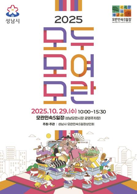 [메이저뉴스]성남시는 오는 10월 29일 오전 10시부터 오후 3시 30분까지 모란민속5일장(중원구 둔촌대로 68)에서 ‘2025 모두모여모란’ 축제를 연다.