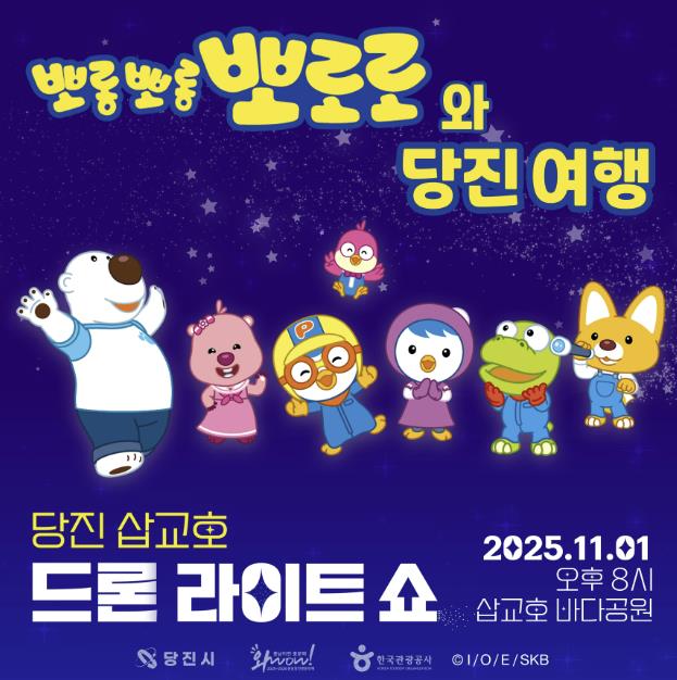 [메이저뉴스]당진시는 오는 11월 1일 삽교호관광지 바다공원 일원에서 ‘뽀롱뽀롱 뽀로로와 당진 여행’을 주제로 2025 당진 삽교호 드론 라이트 쇼의 화려한 폐막 공연을 개최한다고 27일 밝혔다.