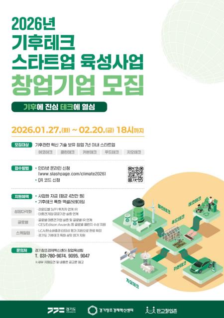 지원 대상은 기후 관련 혁신 기술을 보유한 창업 7년 내 스타트업으로, 2월 20일 오후 6시까지 필요 서류를 갖춰 온라인 신청 하면 된다.