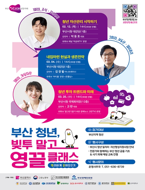 [메이저뉴스]부산시는 급변하는 금융 환경 속에서 지역 청년들이 올바른 자산관리를 통해 경제적 자립 기반을 다질 수 있도록 오는 2월 12일부터 총 3회에 걸쳐 '부산청년, 빚투 말고 영끌(영리하게 끌어모으기) 클래스'를 개최한다고 밝혔다.