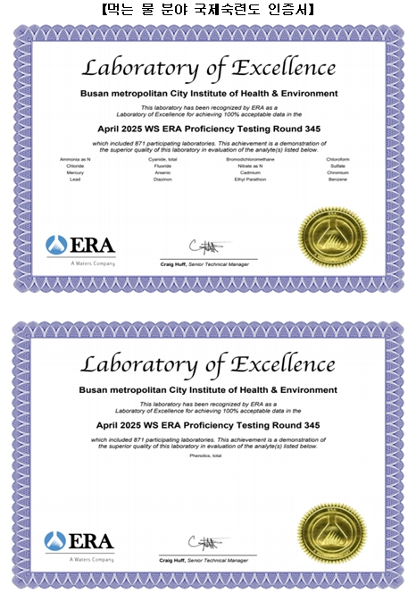 [메이저뉴스]부산시 보건환경연구원은 먹는 물 분야 분석 능력 검증을 위해 참가한 미국 환경자원협회(ERA) 주관 국제숙련도 평가에서 전 항목 '만족' 판정을 받아 '최고 등급' 인증을 획득했다고 밝혔다.
