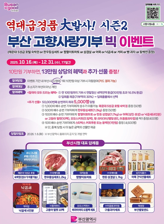 [메이저뉴스]부산시는 오늘(16일)부터 12월 31일까지 77일간, 고향사랑기부제 참여 확산을 위해 '역대급 경품 대발사 시즌2! 부산 고향사랑기부제 연말 빅 이벤트'를 개최한다고 밝혔다.