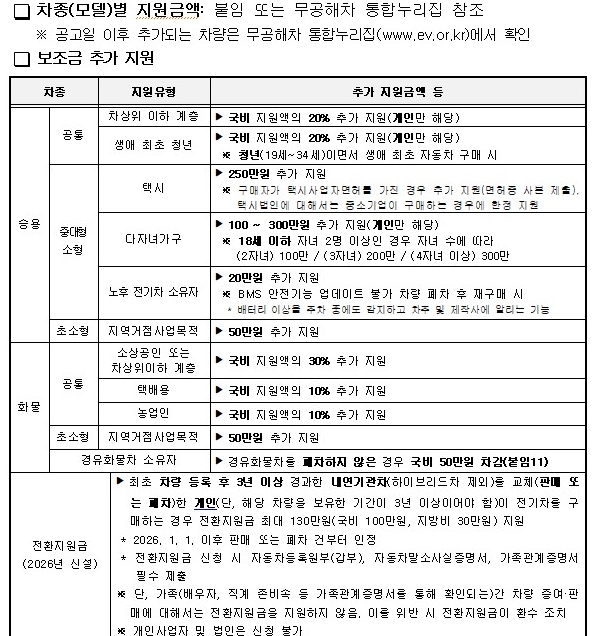 차종별 보조금 지원 금액과 추가 지원 대상 조건 등은 무공해차 통합누리집에 게시된 공고문을 통해 확인할 수 있다.