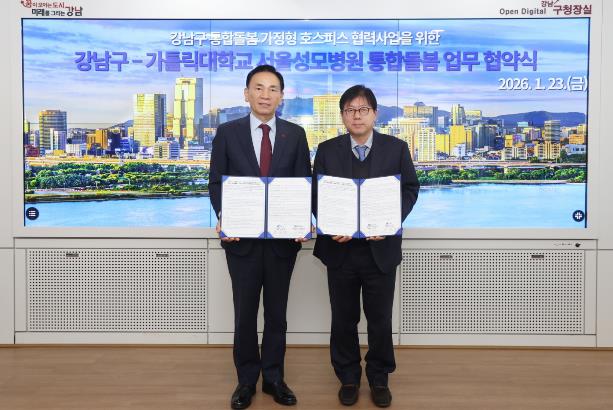 [메이저뉴스]꿈이 모이는 도시, 미래를 그리는 강남구가 1월 23일 구청에서 가톨릭대학교 서울성모병원과 ‘강남구 통합돌봄 가정형 호스피스 협력사업’ 추진을 위한 업무협약(MOU)을 체결했다. 이 협약은 자치구와 상급종합병원이 연계해 가정형 호스피스를 지원하는 체계를 공식화했다는 점에서 그 의미가 크다.