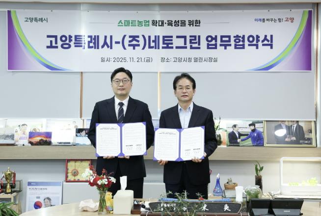 [메이저뉴스]고양특례시는 지난 21일(금) ㈜네토그린과 ‘스마트농업 확대·육성을 위한 업무협약(MOU)’을 체결했다고 밝혔다.
