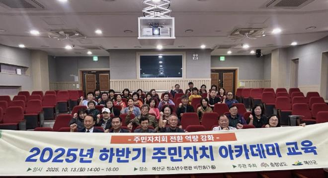 [메이저뉴스]예산군은 예산군청소년수련관 비전홀에서 주민자치회 미전환 읍면 주민자치위원 50여명을 대상으로 ‘2025년 하반기 주민자치 아카데미 집합교육’을 진행했다고 17일 밝혔다.