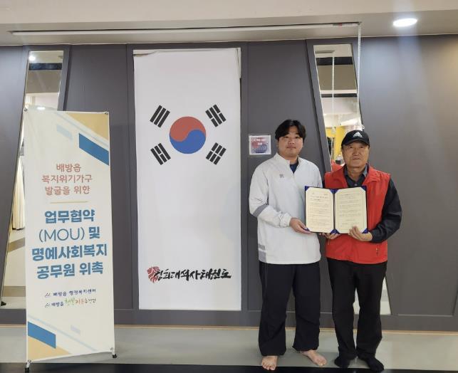 [메이저뉴스]아산시 배방읍 행복키움추진단은 지난 20일 공수리에 위치한 경희대 석사 태권도학원(대표 박초롱)과 위기가구 발굴을 위한 업무협약을 체결했다.