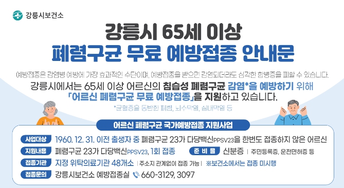 65세 이상 어르신 폐렴구균 예방접종은 주소지와 관계없이 지정의료기관에서 무료로 접종할 수 있으며, 이와 함께 독감과 코로나 백신 무료접종도 진행되고 있다.