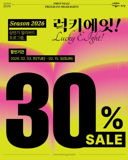 [메이저뉴스]안동문화예술의전당은 상반기 주요 공연을 대상으로 30% 할인 혜택을 제공하는 특별 프로모션 ‘럭키에잇!’을 진행한다고 밝혔다.