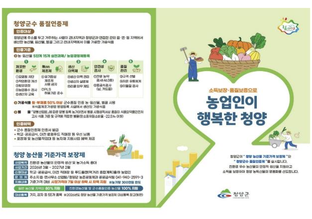 [메이저뉴스]청양군은 농산물 가격 하락으로 인한 농가의 경영 불안을 해소하고, 안정적인 소득 기반을 마련하기 위해 2026년 청양 농산물 기준가격 보장제 신청·접수를 시작했다.