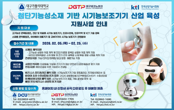 [메이저뉴스]대구광역시는 산업통상부, 경상북도와 함께 ‘2026년 첨단 기능성 소재 기반 시(視)기능 보조기기 육성사업’을 본격 추진하고, 참여기업을 모집한다.