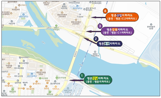 [메이저뉴스] 울산시는 유사한 명칭을 사용해 위치 혼선 우려가 컸던 명촌교 일대 산업로, 강남·강북로에 위치한 4개 지하차도에 대해 명칭을 정비했다고 밝혔다.