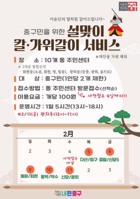 중구민이라면 누구나 이용료‘100원’만 내면, 칼과 주방 가위를 합쳐 1인당 최대 두 자루까지 갈 수 있다. 칼갈이를 이용하려면, 2월 4일까지 동 주민센터로 방문해서 신청해야 한다. 하루 최대 120자루까지 접수받는 만큼, 서둘러 신청하는 것이 좋다.