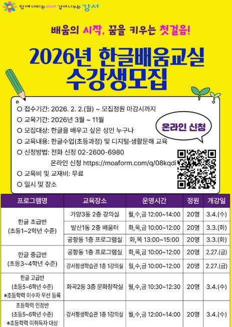 한글을 배우고 싶은 강서구 거주 성인이면 누구나 신청할 수 있고, 정원 마감 시까지 전화 및 온라인으로 접수하면 된다. 수업료와 교재는 전액 무료다.