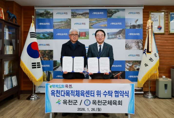 [메이저뉴스]옥천군은 26일 지역 생활체육의 새로운 거점이 될 ‘옥천다목적체육센터’의 효율적인 관리와 전문적 운영을 위해 옥천군체육회(회장 이철순)와 위·수탁 협약을 체결했다고 밝혔다.