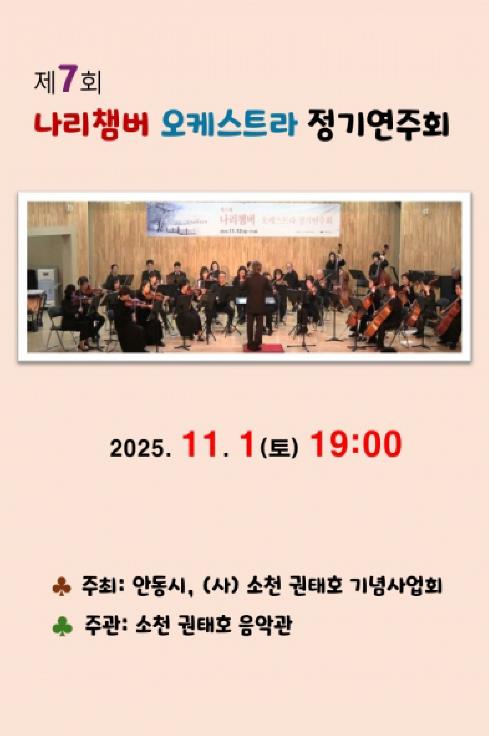 [메이저뉴스](사)소천권태호선생기념사업회가 주최․주관하는 ‘제7회 나리챔버오케스트라 정기연주회’가 11월 1일 오후 7시, 안동시 소천권태호음악관 실내 연주홀에서 개최된다.