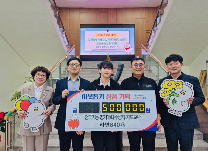 [메이저뉴스]김해시는 2일 전국기능경기대회 수상자와 지도교사가 수상을 기념해 라면 840개(50만원 상당)를 기탁했다고 밝혔다.