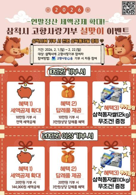 [메이저뉴스]삼척시는 2026년 고향사랑기부제 세액공제 혜택 확대를 기념해 설 명절을 맞아 '삼척시 고향사랑기부제 설맞이 이벤트'를 진행한다.