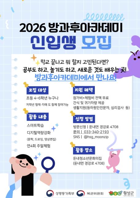 [메이저뉴스]횡성군 둔내청소년문화의집이 지역 청소년의 균형 있는 성장을 돕기 위한 ‘2026년 방과후아카데미’ 신입생을 모집한다.