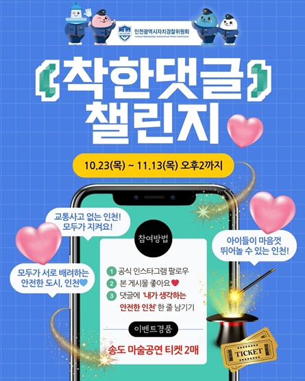 [메이저뉴스]인천광역시는 시민과의 공감과 소통을 강화하고 생활 속 안전 문화를 확산하기 위해 인천광역시자치경찰위원회 공식 인스타그램 채널을 개설하고, 10월 23일부터 11월 13일 14:00까지 ‘내가 생각하는 안전한 인천, 한 줄 남기기’ 착한 댓글 챌린지를 진행한다고 밝혔다.