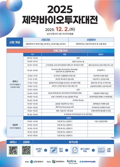 [메이저뉴스]인천광역시가 주최하고 인천관광공사와 KOTRA, 한국제약바이오협회가 공동 주관하는 ‘제약바이오투자대전’이 오는 12월 2일 인천 송도컨벤시아 프리미어볼룸에서 열린다.