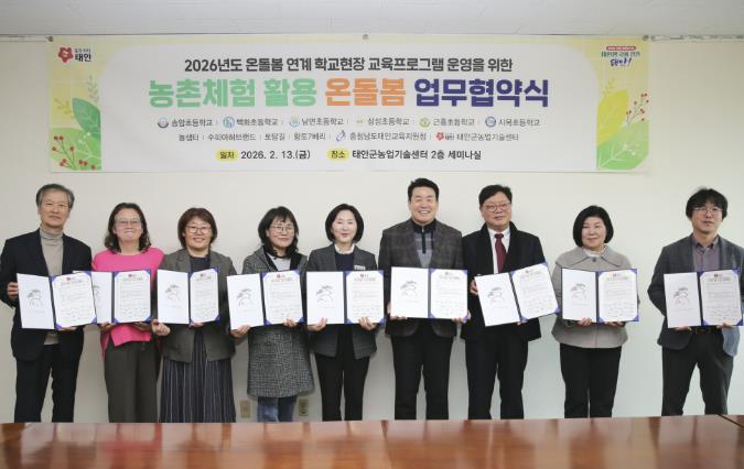 군은 지난 13일 태안군농업기술센터 세미나실에서 임미영 소장과 지재규 태안교육지원청장을 비롯해 관내 6개 초등학교, 체험농장 4곳과 함께 ‘온돌봄 연계 농촌체험 프로그램 운영’ 협약식을 개최했다.