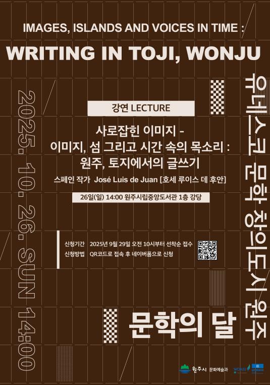 이번 강연은 ‘Images, islands and voices in time: writing in Toji, Wonju(이미지, 섬 그리고 시간 속의 목소리: 원주, 토지에서의 글쓰기)’를 주제로, 작가가 원주에서 집필하며 느낀 한국의 문학적 풍경과 예술적 영감을 공유하는 자리다. 문학을 통해 세계와 지역이 소통하는 유네스코 창의도시의 정체성을 보여주는 ‘2025 원주 문학의 달’의 뜻깊은 기념행사로 마련됐다.