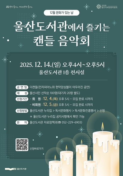 [메이저뉴스]울산도서관은 12월 문화가 있는 날을 맞아 오는 12월 14일 ‘겨울 도서관 양초(캔들) 음악회’를 개최한다고 밝혔다.