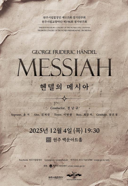 [메이저뉴스]원주 시립합창단과 시립교향악단은 오는 12월 4일 오후 7시 30분 백운아트홀에서 정기연주회 ‘헨델의 메시아’를 개최한다.