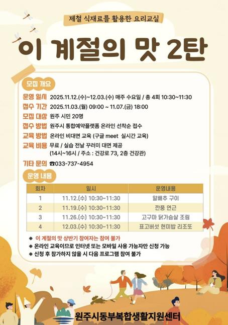 [메이저뉴스]원주시 동부복합생활지원센터는 오는 11월 3일부터 ‘이 계절의 맛 2탄’ 건강 요리 교실 프로그램 참여자를 모집한다.