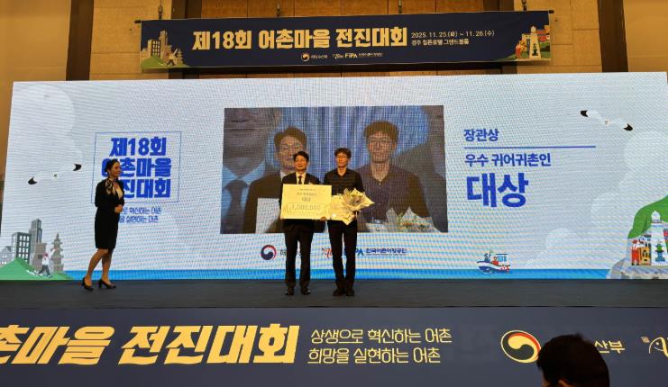 [메이저뉴스]전라남도해양수산과학원은 오늘 경주에서 열린 제18회 어촌마을 전진대회에서 2020년 전남귀어학교 제2기 수료생인 완도 김진호(46) 씨가 우수 귀어귀촌인 대상에 선정돼 해양수산부 장관 표창을 받았다고 밝혔다.
