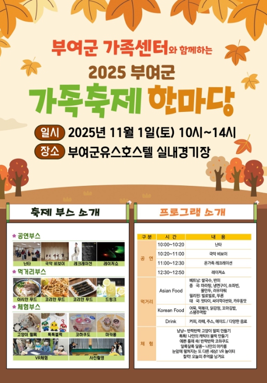 [메이저뉴스]부여군 가족센터는 오는 11월 1일 오전 10시부터 오후 2시까지 부여군유스호스텔 실내경기장에서‘2025년 부여군 가족축제 한마당’을 개최한다고 밝혔다.