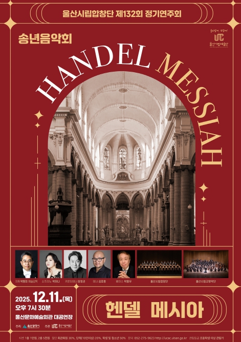 시립예술단 관계자는 “한 해의 끝을 장식하는 이번 송년 음악회는 울산 시민 모두에게 위로와 울림이 되는 시간이 될 것”이라며 “공연장을 찾는 모든 분이 음악으로 위로받고 새해를 향한 희망을 느끼시길 바란다”라고 말했다.