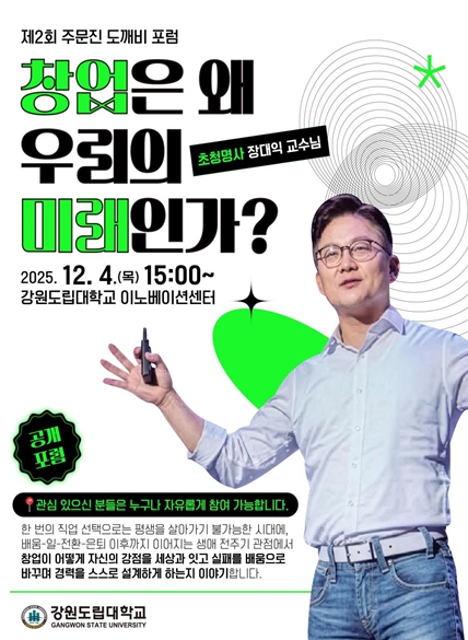 [메이저뉴스]강원도립대학교는 지역주민과 학생을 위한 개방형 지식 교류 프로그램인 '주문진 도깨비포럼: 우리 시대의 명사가 전하는 말'의 두 번째 행사를 오는 12월 4일 오후 3시 강원도립대학교 이노베이션센터에서 개최한다.