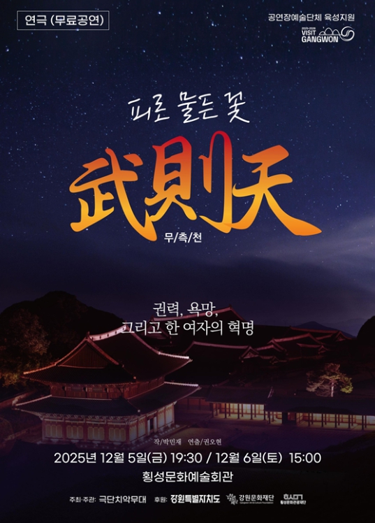 [메이저뉴스](재)횡성문화관광재단과 극단 치악무대가 신작 연극 '무측천-피로 물든 꽃'을 오는 5일 저녁 7시 30분과 6일 오후 3시, 이틀간 진행한다고 밝혔다.