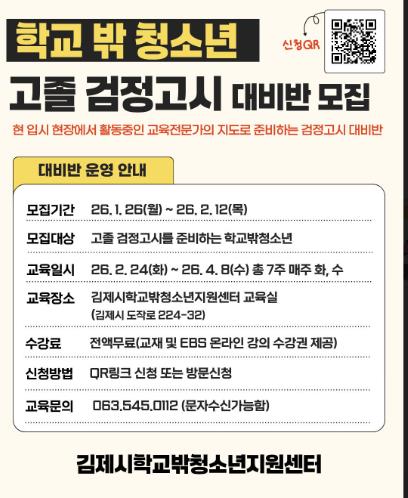 | ▲ 김제시학교밖청소년지원센터, 2026년 검정고시 대비반 모집 |
