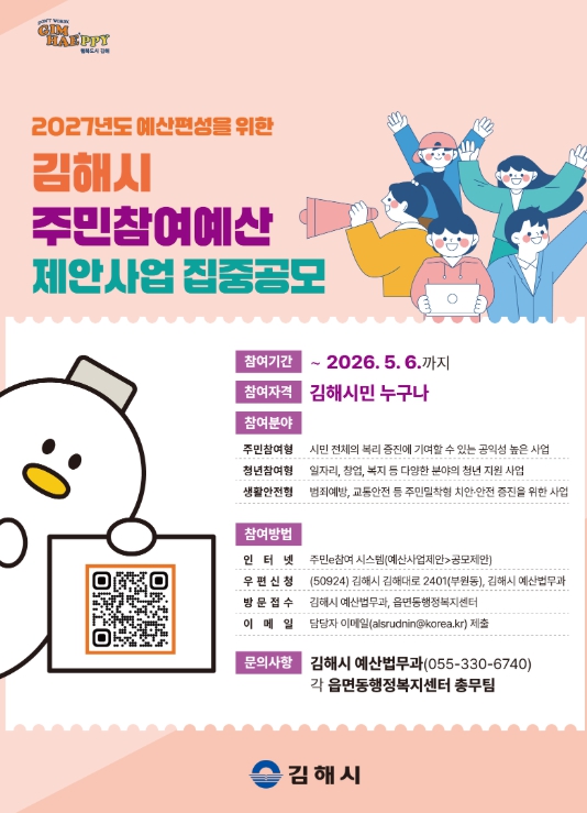 [메이저뉴스]김해시는 23일부터 5월 6일까지 2027년도 예산에 반영할 ‘주민참여예산 제안사업’을 집중 공모한다.