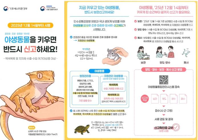 특히 법 시행 전부터 기르던 백색목록 외 지정관리 야생동물은 2026년 6월 13일까지 신고하면 계속 사육할 수 있다