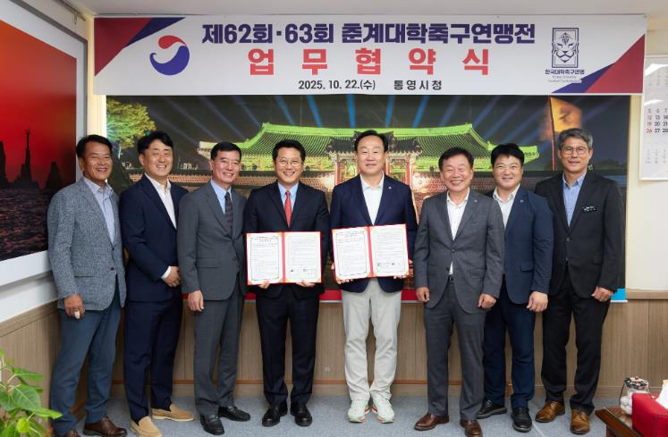 [메이저뉴스]통영시는 지난 22일 2026~2027년'제62회·63회 춘계대학축구연맹전'유치 성공에 따른 업무협약을 체결하고 성공적인 대회 운영을 위해 상호 간 적극 협력하기로 밝혔다.