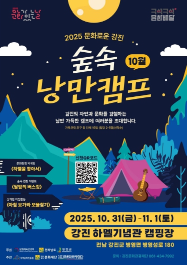 [메이저뉴스]강진군과 강진군문화관광재단은 2025 문화가 있는 날–구석구석 문화배달 사업의 하나로 ‘캠핑과 함께하는 문화로운 강진’ 2차 행사를 오는 10월 31일부터 11월 1일까지 병영면 하멜 감성텐트촌에서 갖는다.