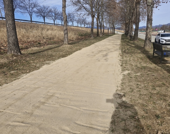 기존 맨발길 1.7km를 전면 정비하고, 미정비 구간 0.8km를 새로 조성해 시민들이 신발을 벗고 자연의 촉감을 느끼며 걸을 수 있는 건강 보행 공간으로 완성했다.