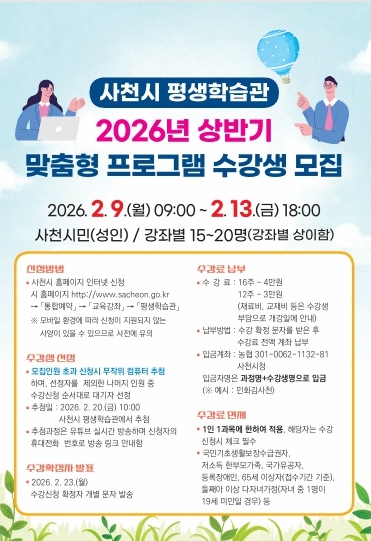 이번 2026년 상반기 맞춤형 프로그램에 대한 궁금한 사항은 사천시청 홈페이지 공지사항에서 확인하거나 사천시 평생학습관으로 문의하면 된다.
