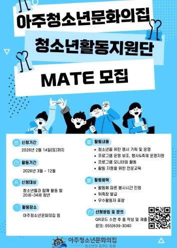 [메이저뉴스]거제시 아주청소년문화의집은 오는 2월 14일까지 2026년 청소년 활동을 이끌어갈 청소년활동지원단“MATE”단원을 모집한다고 밝혔다.