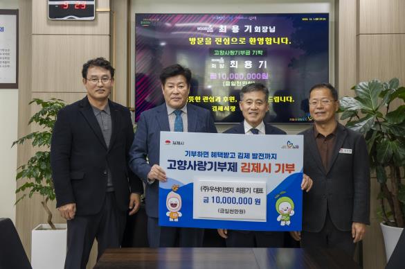 [메이저뉴스]김제시는 2일 ㈜우석이엔씨 최용기 회장이 김제시 고향사랑기부제에 1,000만원을 기탁했다고 밝혔다.