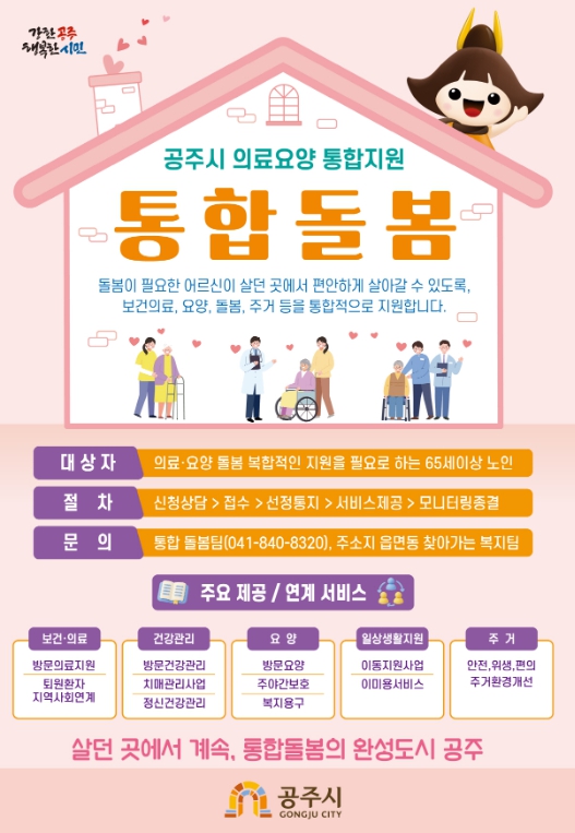 [메이저뉴스]공주시는 3월 27일부터 시행되는 ‘의료·요양 등 지역 돌봄의 통합 지원에 관한 법률’에 맞춰 개인별 맞춤 서비스를 제공하는 ‘지역 돌봄 통합 지원체계(통합 돌봄)’ 운영을 본격화한다고 밝혔다.
