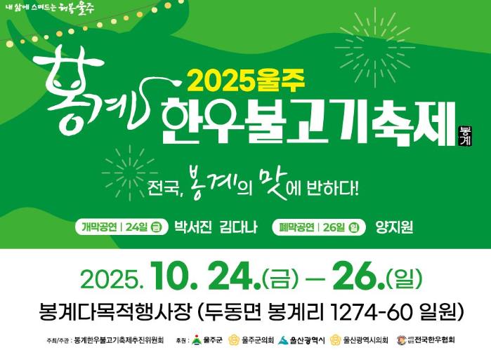 오병국 봉계한우불고기축제 추진위원장은 “이번 축제는 울주군민과 관광객이 함께 즐길 수 있는 참여형 축제로 준비했다”며 “봉계의 맛과 정이 살아 있는 축제를 통해 지역 상권이 활기를 되찾길 바란다”고 말했다.