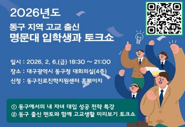 [메이저뉴스]대구 동구청은 오는 6일 오후 6시 30분, 동구청 4층 대회의실에서 관내 학생 및 학부모를 대상으로 ‘2026 내 자녀 대입 성공 전략 특강 및 멘토와 함께 고교생활 미리보기 토크쇼’를 개최한다.