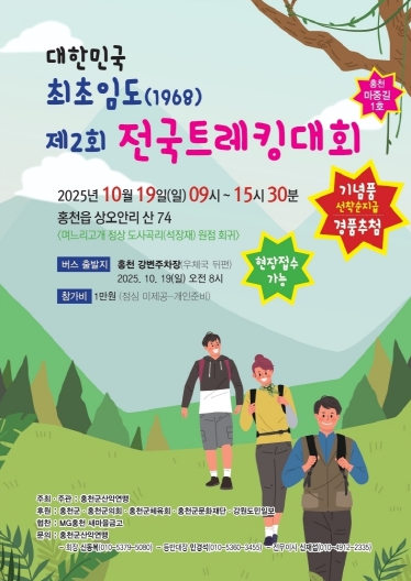 [메이저뉴스]홍천군은 ‘대한민국 최초임도(1968) 제2회 전국트래킹대회’가 10월 19일 오전 9시 홍천군 상오안리 며느리 고개 일원에서 개최된다고 밝혔다.